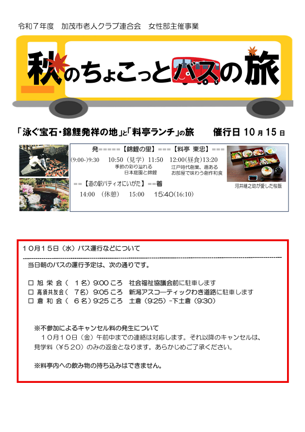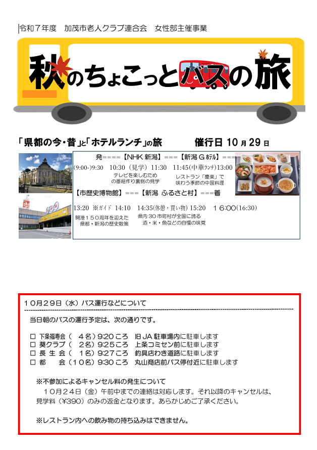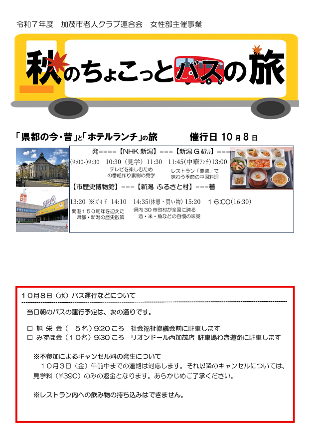 お知らせ,イベント 秋は研修旅行 (市老連女性部主催)10/8,15,29 2025年09月22日 季節はめっきり秋! 気候も落ち着いてきました。女性部研修の一環として、研修旅行を計画しました。コースは以下の通りです。 尚、本年度より、本研修は「女性部主催事業」として、男性も参加可能です。すでに、すべての催行が決定しました。 ↓10/8(水)新潟市方面 ↓10/15(水)小千谷市方面 ↓10/29(水)新潟市方面 ※新潟市方面のコース内容は同じです。 加茂市朗老人クラブ連合会ページへ