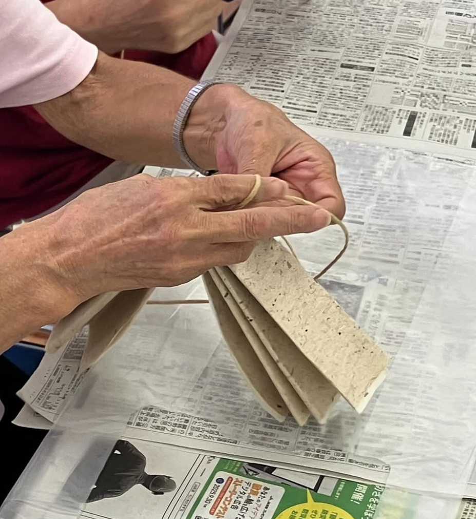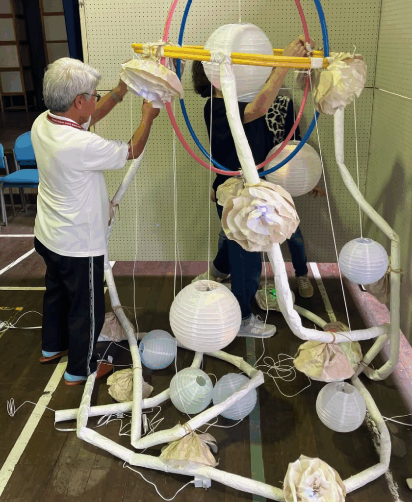 今回の「葩(はな)」は③の「貢献」活動です。今回は、2名の企画部員を中心に、14の単位老人クラブ女性部代表者で集まり、作品制作をしました。なお、制作過程では、市内で美術教室を開催されている長谷川優子様(スタジオきっか)よりアートアドバイザーとして、助言と指導をいただきました。